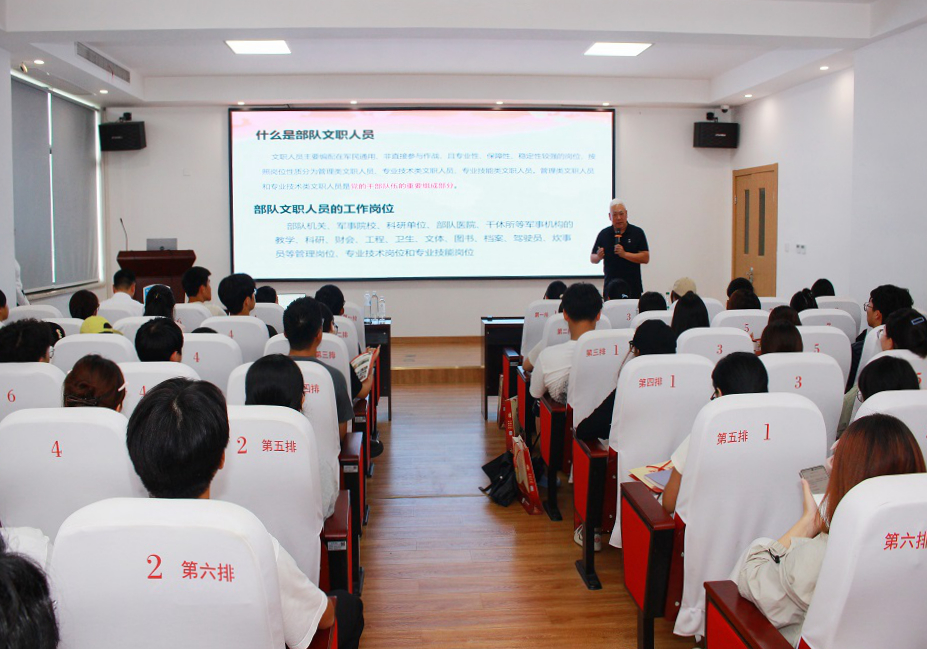 吴晓辉结合自身从军经历和军队文职考试培训经验,围绕政策背景、岗位设置与职业发展等多维度展开深入讲解。通过详实案例与数据,生动展示了军队文职岗位的发展前景,鼓励同学们树立远大目标,积极参与国防和军队建设。