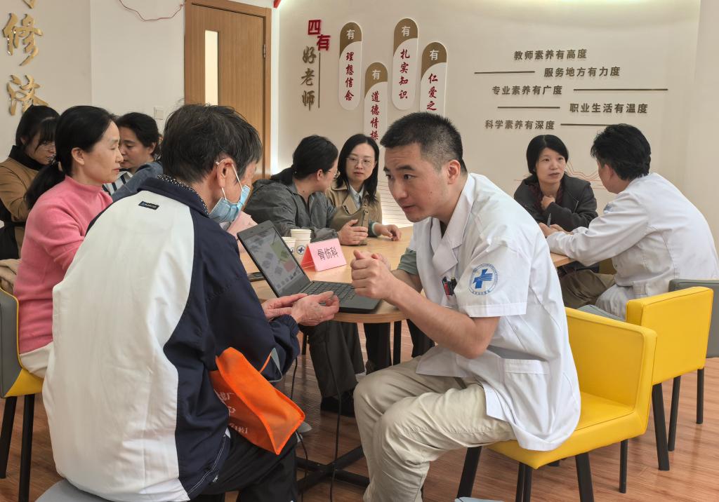 义诊环节是本次活动的核心亮点。台州市中医院内科、针灸推拿科、妇科、护理科等科室资深专家现场坐诊,提供中医体质辨识、颈肩腰腿痛针灸推拿、妇科健康咨询、护理操作体验、耳穴压豆及血压测量等多样化服务。专家们耐心倾听教职工健康诉求,细致解答各类疑问,并针对不同健康状况给出个性化诊疗与保健建议。现场参与氛围热烈,各诊位秩序井然,其中针灸推拿、耳穴压豆等能即时缓解疲劳的特色服务,更是吸引大量教师亲身体验,让大家直观感受传统中医的独特疗效与魅力。
