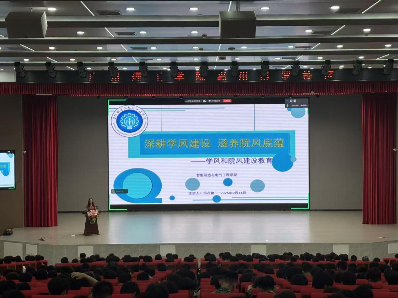 为引导新生坚定理想信念、尽快适应大学学习生活、营造奋发向上的育人环境,9月11日晚,智能制造与电气工程学院在惠州校区大礼堂及1栋教学楼同步举行2025级普通高等教育新生入学教育——《学风与院风建设》专题讲座。本次讲座采用线上线下相结合的方式,确保全员覆盖。学院党总支书记吕在艳担任主讲,全体新生一同参会。