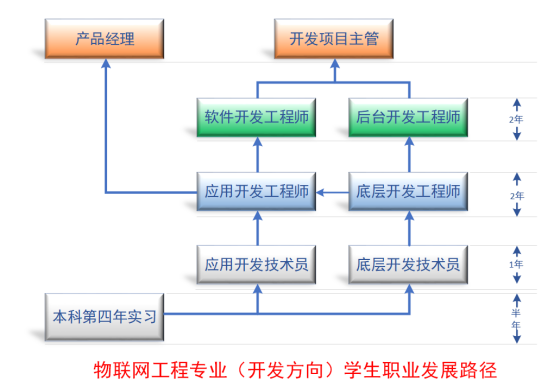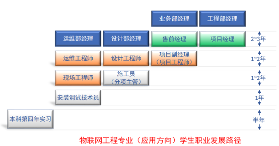 根据我们对珠三角地区的物联网行业于企业人才的需求的调研,针对本科生的需求,偏向于1底层开发/应用端开发的开发能力,2系统解决方案设计能力、项目施工管理能力、市场业务能力这样的应用能力。我们也统计了我们学院的毕业生毕业后1-3-5-7年的职业生涯的发展路径,如下图表所示: