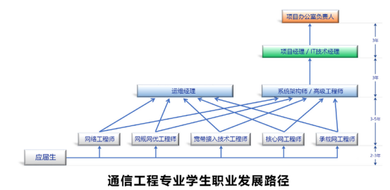 通信工程类的学生,一般只有应用类的岗位,通过毕业三年后的岗位锻炼,成为工程师,毕业后5-6年成为高级工程师和主管经理,之后就是项目经理。