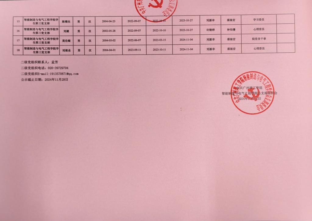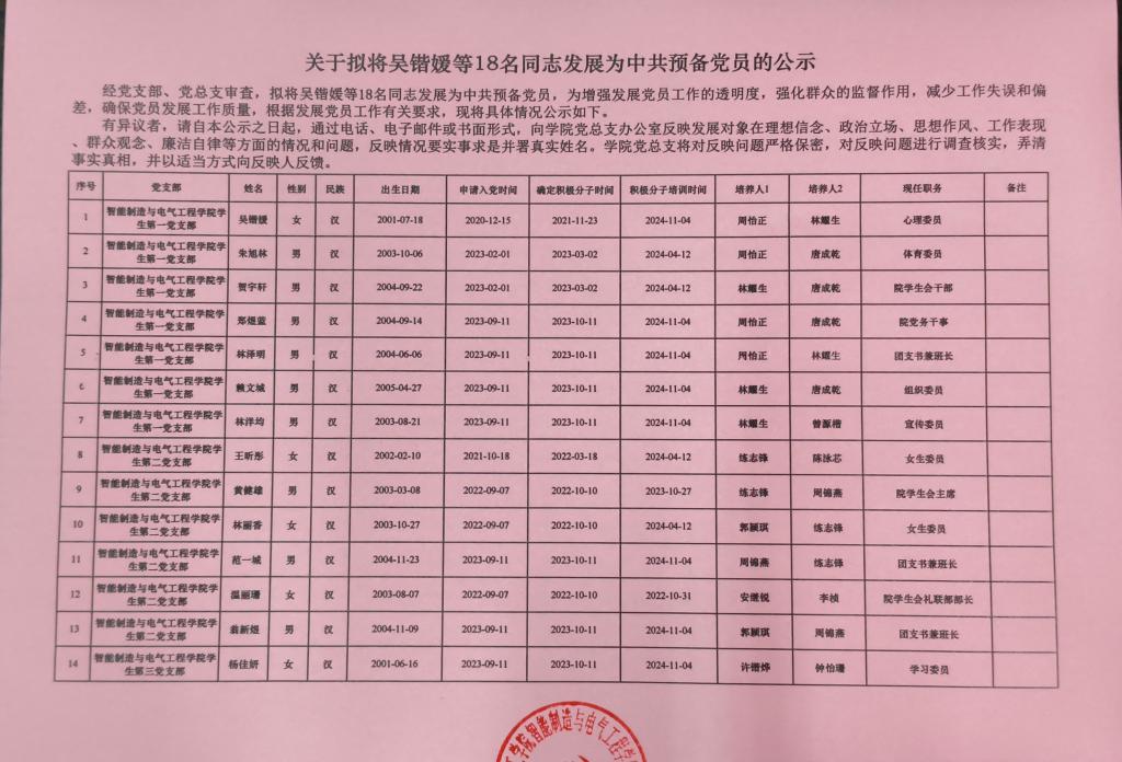 经党支部、党总支审查,拟将吴锴媛等18名同志发展为中共预备党员,为增强发展党员工作的透明度,强化群众的监督作用,减少工作失误和偏差,确保党员发展工作质量,根据发展党员工作有关要求,现将具体情况公示如下: