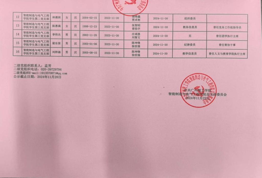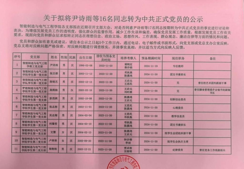 智能制造与电气工程学院各支部拟在近期召开支部大会,对是否同意尹诗雨等16名同志按期转为中共正式党员的事宜进行讨论和表决,为增强发展党员工作的透明度,强化群众的监督作用,减少工作失误和偏差,确保党员发展工作质量,根据发展党员工作有关要求,现面向党员和群众征求拟转正同志在理想信念、政治立场、思想作风、工作表现、群众观念、廉洁自律等方面的情况和问题。