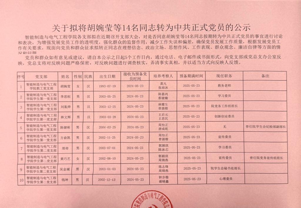 智能制造与电气工程学院各支部拟在近期召开支部大会,对是否同意胡婉莹等14名同志按期转为中共正式党员的事宜进行讨论和表决,为增强发展党员工作的透明度,强化群众的监督作用,减少工作失误和偏差,确保党员发展工作质量,根据发展党员工作有关要求,现面向党员和群众征求拟转正同志在理想信念、政治立场、思想作风、工作表现、群众观念、廉洁自律等方面的情况和问题。