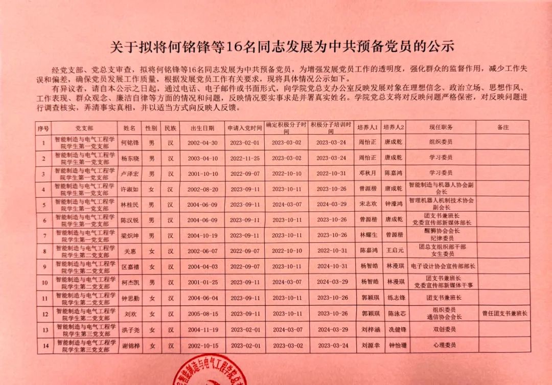 经党支部、党总支审查,拟将何铭锋等16名同志发展为中共预备党员,为增强发展党员工作的透明度,强化群众的监督作用,减少工作失误和偏差,确保党员发展工作质量,根据发展党员工作有关要求,现将具体情况公示如下。