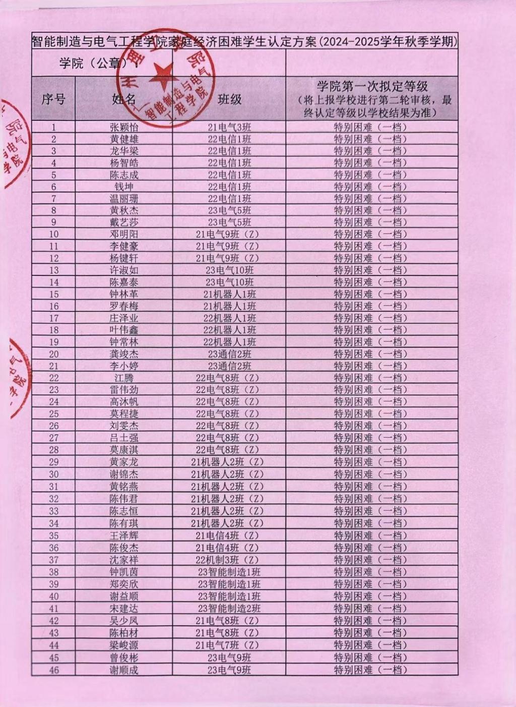 为全面了解和掌握学校家庭经济困难学生的基本情况,公平、公正、合理地分配资助资源,切实保证各项资助政策和措施真正落实到家庭经济困难学生身上,根据上级相关文件精神,智能制造与电气工程学院经学生本人申请以及班级、学院评审小组评定,现将我院2024-2025学年家庭经济困难学生认定初审结果进行公示,公示时间为2024年9月25日至2024年9月27日。