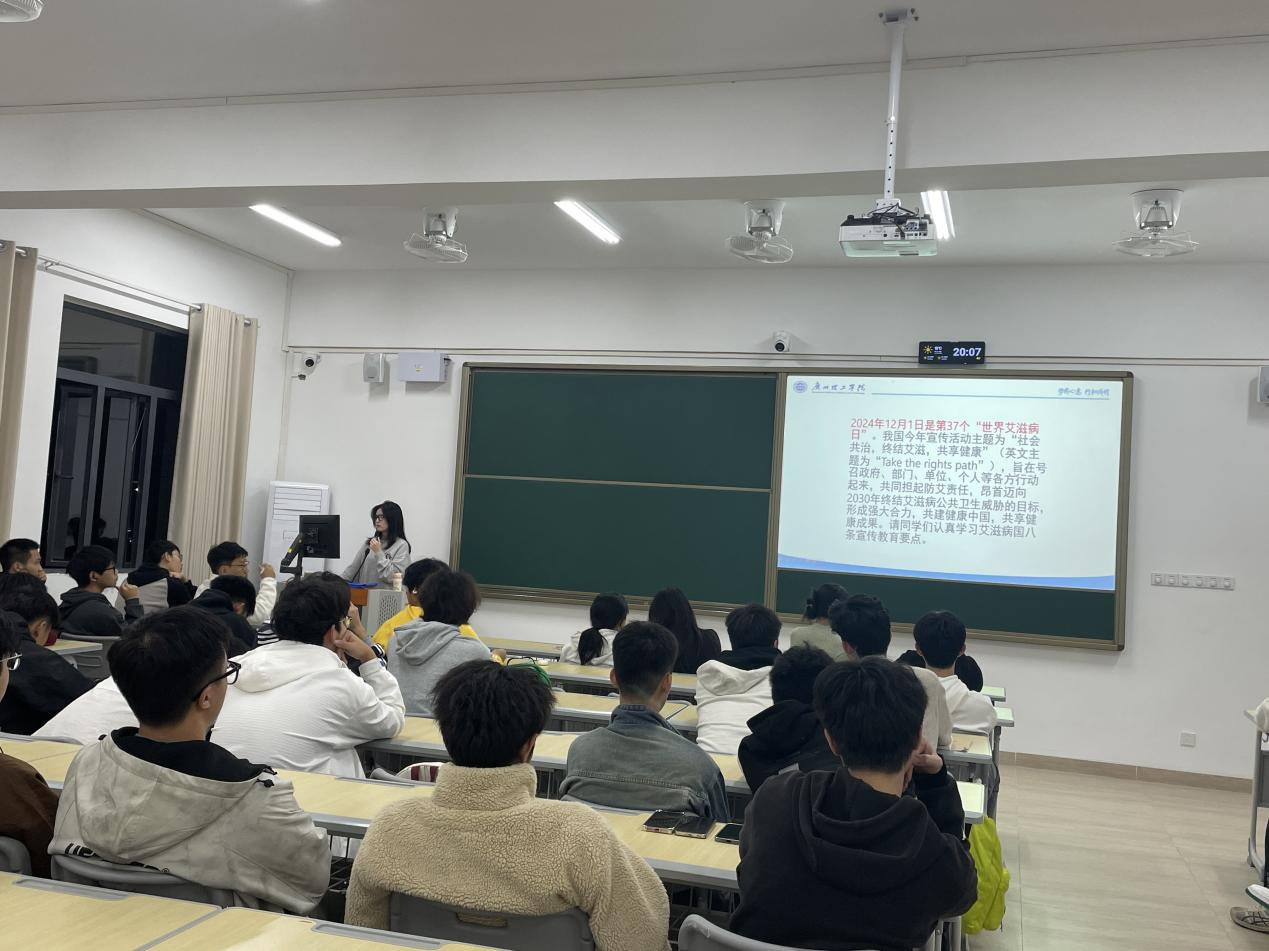 班会伊始,各班团支书兼班长详细讲解了艾滋病的基本概念、传播途径、症状详情及预防方法等相关内容,让同学们对艾滋病有了最基本认知,并通过真实直观的案例,让同学们深刻认识到艾滋病的严重性以及危害。随后,各班组织艾滋知识答题竞赛,检验同学们对于艾滋病基本知识的掌握程度,最后,各班辅导员老师提醒同学们要洁身自好避免高危行为的发生,也积极倡导大家宣传艾滋病预防知识,为构建健康校园贡献自己力量。