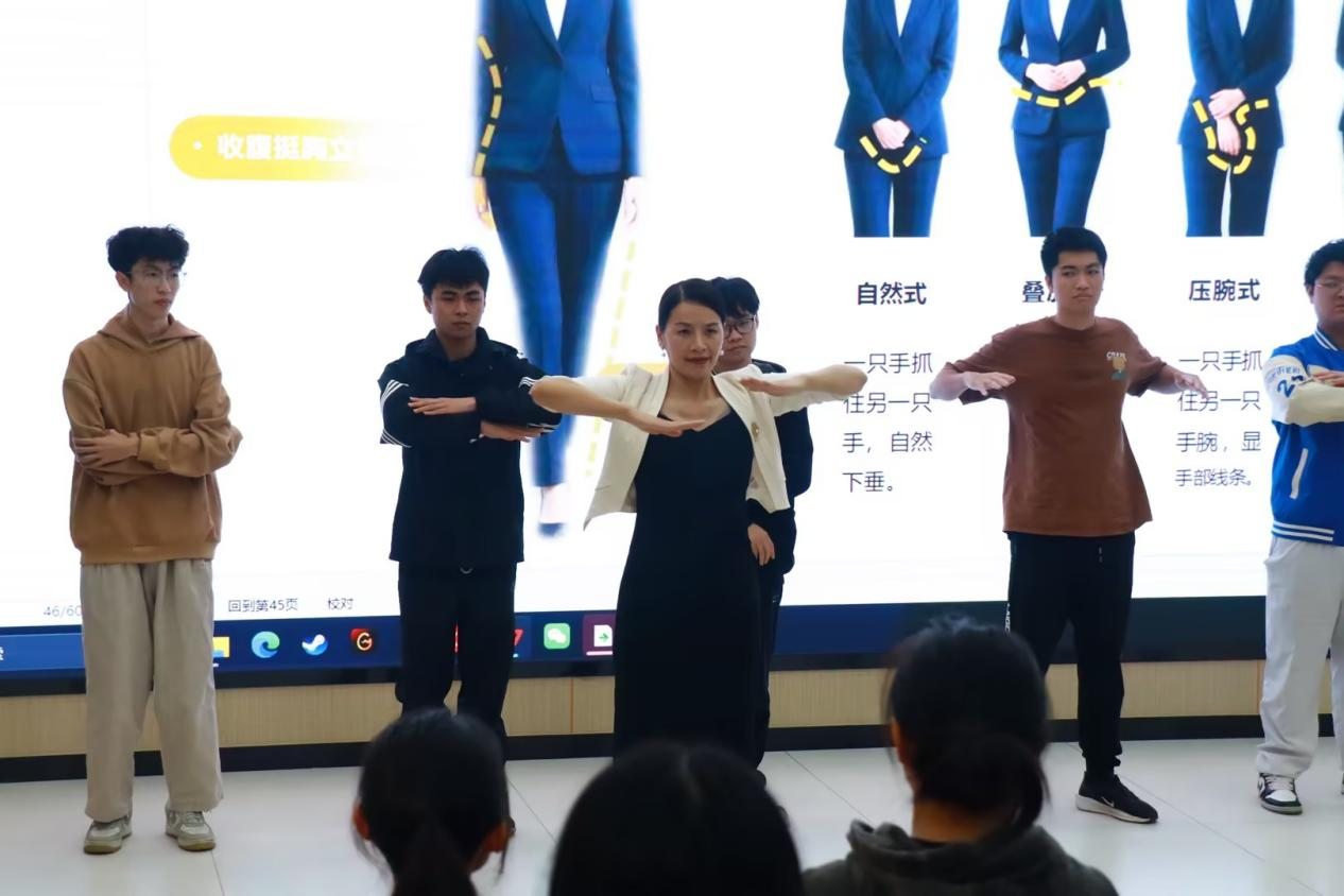 理论讲解结束后,培训进入了精彩的互动实践环节。在黄悠老师的亲自带领和指导下,同学们纷纷起身,积极参与到站姿、手势、行走等体态的练习中。黄老师耐心地为每一位同学纠正动作,让大家在亲身体验中掌握要领,现场学习氛围浓厚而活跃。