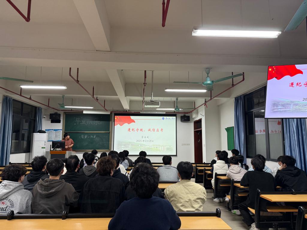 为营造公平公正的考试环境,强化学生的纪律意识与诚信品格,12月28日晚,智电学院于13栋教学楼各班教室召开了“遵纪守规,诚信应考”主题班会。此次班会由各辅导员主持,各班班长主讲,全体学生积极参与。