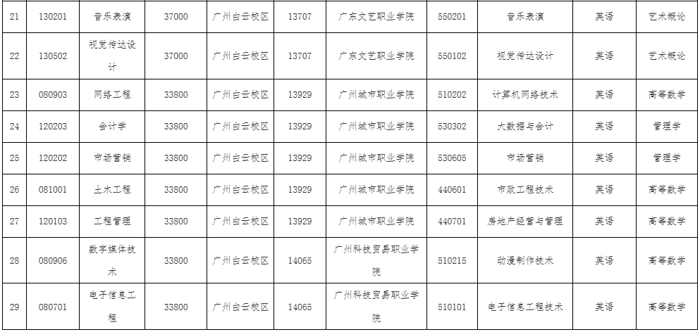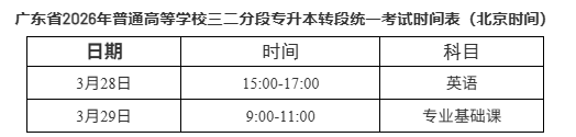 5.统一考试科目各科满分为100分,两科总分为200分。每科考试时间为120分钟。统一考试科目的考试要求由省教育考试院根据教育部专科升本科同一层次的要求编写确定,详见《广东省2026年普通高等学校专升本招生专业目录及考试要求》。