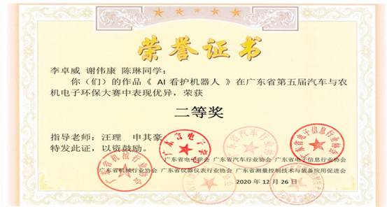 12月26日,广东省第五届汽车与农机电子环保大赛在华南农业大学举行,我校电气学院胡静、劳小鉴和苏瑞同学设计的《基于云识别的多功能小车》与李卓威、谢伟康和陈琳同学设计的《AI看护机器人》分别获得二等奖。