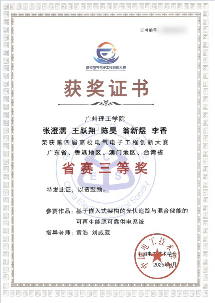 近日,由中国电工技术学会主办的第四届高校电气电子工程创新大赛于8月中旬圆满落幕。由我校智能制造与电气工程学院黄浩、刘威葳、李顺、汪理四位教师指导的两支参赛队伍,历经初赛严格筛选与省赛激烈角逐,凭借扎实的专业基础、创新的技术方案与出色的实践表现脱颖而出,最终双双斩获省级三等奖,充分展现了我校在电气电子工程领域的教学成果与学生创新实力。