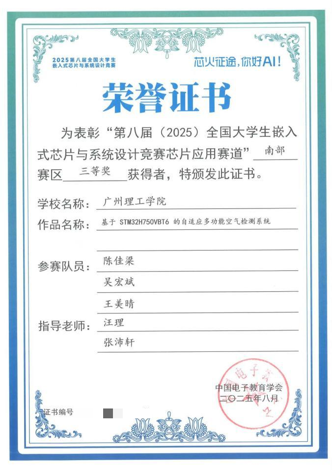 近日,2025年嵌入式芯片与系统设计竞赛广东省赛顺利落幕。智能制造与电气工程学院派出参赛团队,在汪理老师和张沛轩老师的指导下,凭借“自制的空气检测仪”项目荣获省级三等奖。