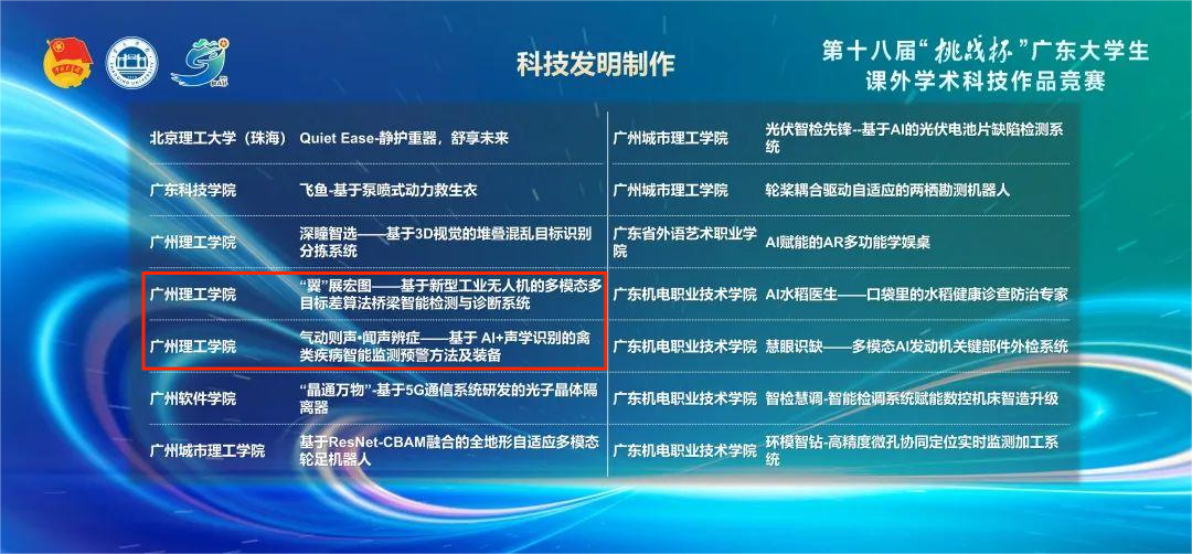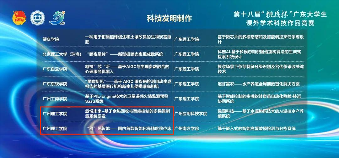 5月17日至19日,由共青团广东省委员会、广东省教育厅、广东省科学技术厅等单位联合主办的2025年“挑战杯”大学生课外学术科技作品竞赛终审决赛在肇庆市圆满落幕。广州理工学院智能制造与电气工程学院师生团队共斩获7个奖项,其中特等奖1项、一等奖1项、二等奖3项、三等奖2项,充分展现了学院在科技创新领域的深厚底蕴与青春风采。